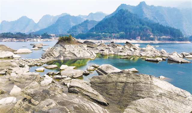 1月18日,黔江区小南海景区,露出水面的地震滚石上演“海枯石烂”的壮观景象。