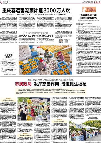 在安全生产方面,重庆将强化对低温雨雪冰冻等灾害的主动防御和应急处置,加强应急力量和物资预置,及时开展除冰除雪作业,确保春运安全顺畅。