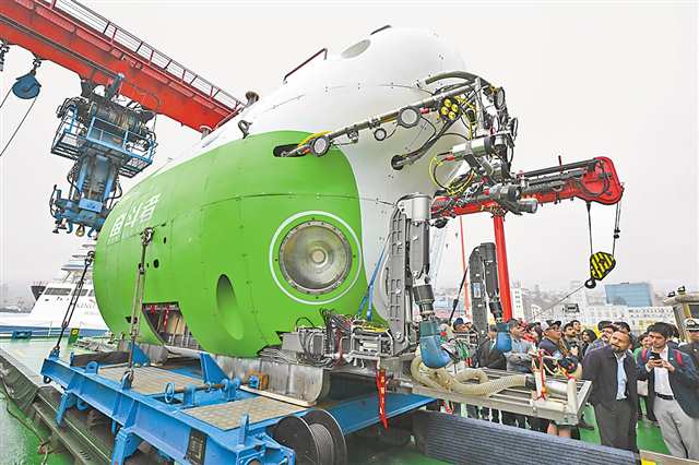 1月19日,在停靠于智利中部瓦尔帕莱索港的中国“探索一号”科考船上,人们参观“奋斗者”号载人潜水器。