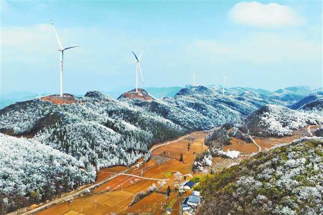 连日来的冻雨天气,致黔江区麒麟盖成为雾凇世界。麒麟风电场的风力发电机组“大风车”和麒麟盖光伏发电站的光伏板不停运转,将云端清风转化成点亮万家灯火的绿色电能。
