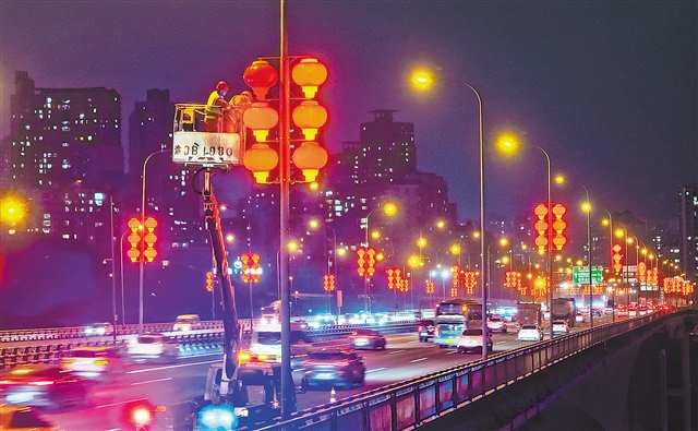 重庆城区迎春灯饰即将全面点亮,灯饰安装工作正在加紧推进,力争本月内完成80%、2月7日前全部安装完成。迎春灯饰亮灯时间将持续到3月3日元宵节。