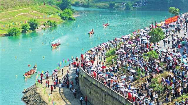彭水郁山镇举行龙舟竞赛,参赛选手正划着龙舟奔赴参赛现场 |