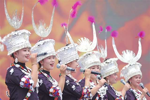 在彭水蚩尤九黎城景区,演员们正在给游客表演独具苗乡特色的歌舞 |