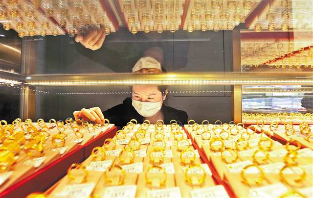 1月26日,江苏省连云港市连云区一家黄金店店员在整理黄金饰品。