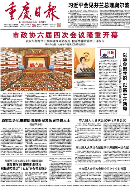 习近平会见芬兰总理奥尔波市政协六届四次会议隆重开幕以盛会聚共识 以实干开新局袁家军会见市政协港澳委员及侨界特邀人士市六届人大四次会议举行预备会议市六届人大四次会议举行主席团第一次会议充分发挥专门协商机构作用 积极助力重庆“十五五”开好局起好步市六届人大四次会议今日上午9时开幕