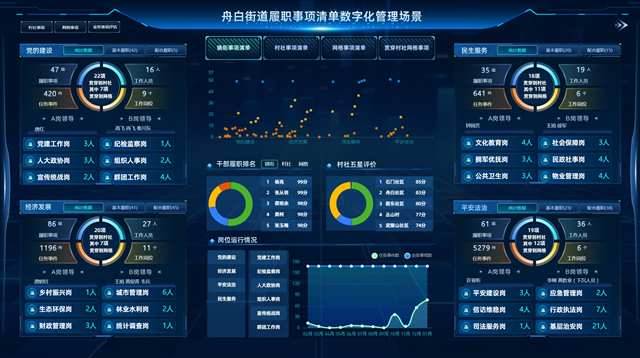 走进舟白街道基层治理指挥中心,数字大屏上实时更新履职清单、人员信息、岗位运行情况、各类任务办理进度等内容,街道工作一览无余。