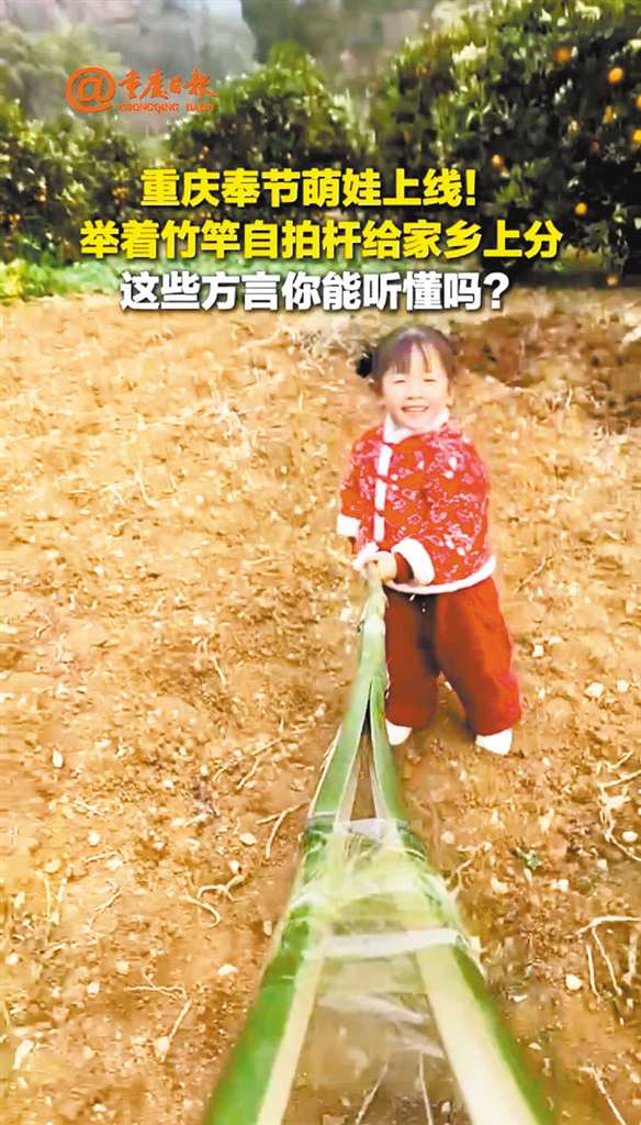 “嗲嗲,你在搞么哩?鸡子卖不卖?”稚嫩的奉节方言脆生生喊出。镜头里,4岁女孩高欣羽正用肉乎乎的小手攥着两米长的竹竿一头,另一头用透明胶歪歪扭扭绑着手机——这是她自制的“拍摄工具”。晃晃悠悠的竹竿让画面跟着抖个不停,满是童真趣味。
