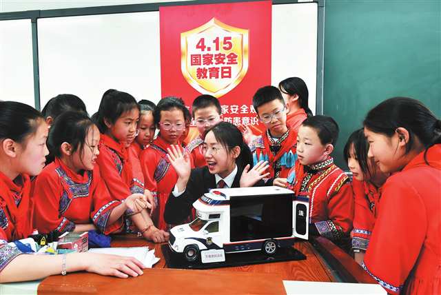 云阳县法院青年干警向学生们介绍5G“车载便民法庭” 摄/饶国君 |
