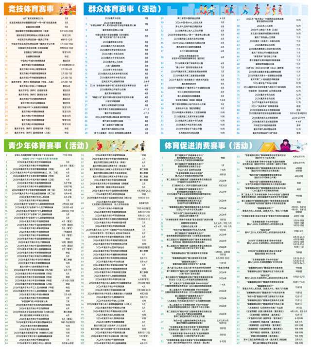 近日,重庆市体育局正式发布2026年重庆市精品体育赛事活动计划表。计划表涵盖竞技体育、群众体育、青少年体育及体育促消费四大板块,全年预计举办近300项精品赛事活动,促进形成“层层有赛事、人人可参与”的体育惠民新图景。