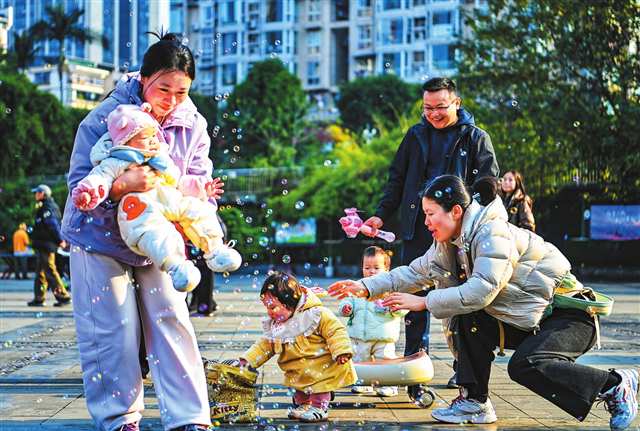 父母带着小朋友在广场上晒太阳玩泡泡 摄/齐岚森 |