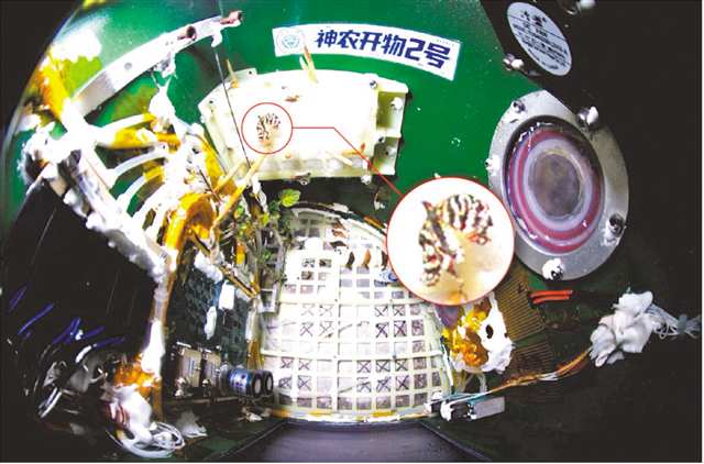 近期,团队在地面接收到的试验数据表明,载荷密封舱内气压、温湿度等技术指标稳定正常。更令团队感到欣喜的是,传回的照片发现:携带的柑橘凤蝶蛹在微重力环境下成功孵化成蝶。新生蝴蝶个体挣脱蛹壳后,在载荷密闭舱内灵活穿梭,时而停留在植株叶片上,时而自由飞翔。