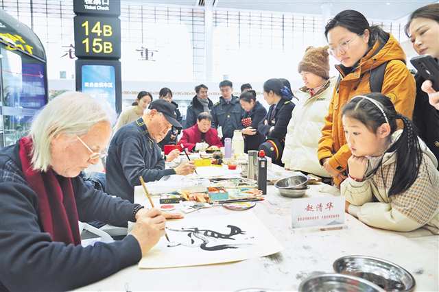 2月2日,重庆东站候车室内,书画家为旅客创作新春作品。通讯员 魏伟 摄/视觉重庆 |
