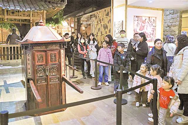 2月3日,渝中区重庆(中国)三峡博物馆,市民和游客正在三峡民俗展厅里观看民俗展品花轿。