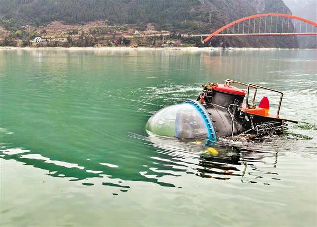 2月4日,巫山县双龙镇,长江之畔。随着起重臂缓慢下移,一台名为“鲛子号”的观光载人潜水器平稳下水,再度进行水下测试作业。