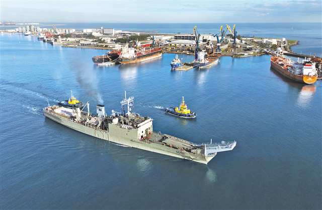 2月8日,在墨西哥韦拉克鲁斯港,装载人道主义援助物资的舰船启程前往古巴(无人机照片)。