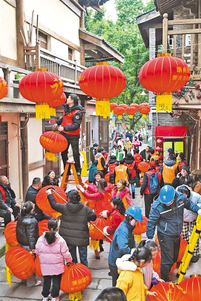 2月10日,南岸区黄葛古道,志愿者和社区居民在挂灯笼、贴春联,张灯结彩迎新春。新春将至,南岸区海棠溪街道敦厚街社区,猜灯谜、挂灯笼、贴春联、品汤圆,一系列接地气、有温度的民俗活动,营造出欢乐、祥和、文明、和谐的新年气氛。特约摄影 郭旭/视觉重庆