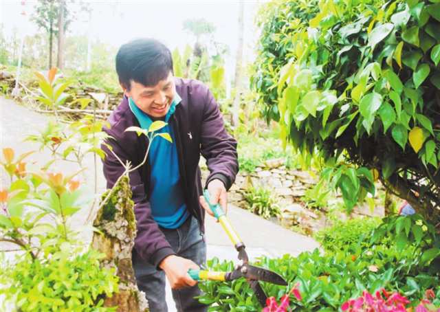 彭水县龙塘乡石院村,村民卢国军正在修剪自己栽种的绿植。受访者供图 |