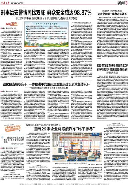 2月11日,市政府新闻办召开2026年“平安重庆建设”主题新闻发布会。记者从会上获悉,去年平安重庆建设83项具体量化指标全面完成,重庆刑事、治安警情同比分别下降15.4%、14.1%,群众安全感达98.87%。