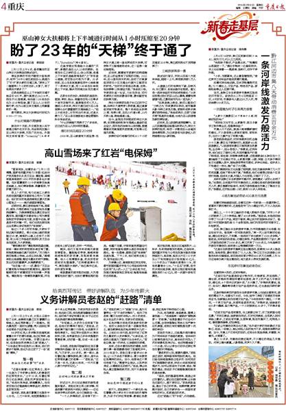 近段时间,景区游客络绎不绝,造雪机、缆车、升降机等电力设备用电负荷量持续攀升。为确保滑雪场及景区安全可靠用电,国网重庆丰都供电公司为滑雪场制定专项保供电方案,冰雪中巡线,便是其中的关键一环。他们也因此被当地企业和群众亲切地称为“电保姆”。