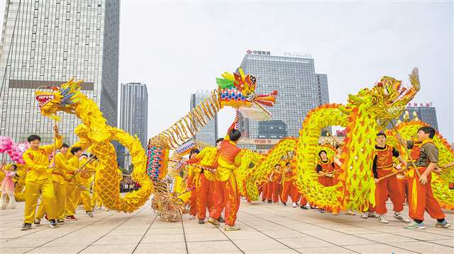 2月17日,正月初一,铜梁城区锣鼓震天,2026年铜梁新春龙舞大巡游活动启幕,汇聚大蠕龙、稻草龙、竹梆龙等14种铜梁特色舞龙,以及鲤鱼灯、狮子灯、猪啃南瓜等7组特色灯组,吸引了超10万游客现场观看。在巡游沿途各路口打卡点,表演者们一边表演,还一边邀请路边观众加入舞龙队伍,热闹非凡。