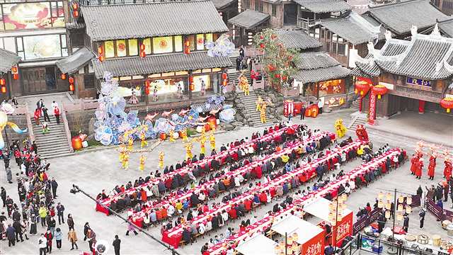 二月十六日,永川区松溉古镇摆起“九大碗”长桌宴,居民与游客共品非遗美食,在烟火气中迎接新春。(无人机照片)特约摄影 陈仕川\视觉重庆