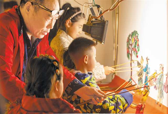 二月十六日,南川区东街文旅小镇,皮影艺人指导孩子们体验皮影表演。特约摄影 罗川\视觉重庆