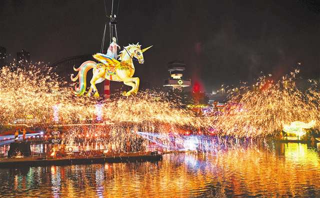 2月17日,重庆欢乐谷,新春大妙会上,飞天骏马载着“仙女”凌空散花,上演一场视觉盛宴。记者 张锦辉 摄/视觉重庆