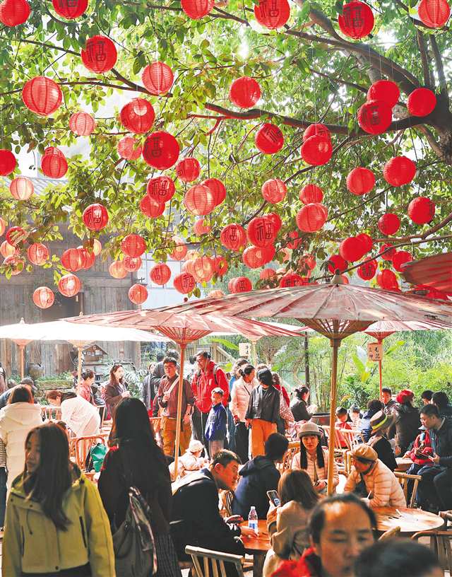 2月19日,南岸区黄桷垭老街,市民游客在黄葛树下品茶小憩。特约摄影 钟志兵/视觉重庆
