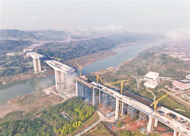 在宝山嘉陵江大桥建设现场,塔吊耸立云天,蓝色挂篮悬空作业,将一段段混凝土箱梁精准浇筑。这座大桥是快速路五联络线的关键工程,连接蔡家与悦来,进一步优化中心城区跨江交通布局,为沿线产业升级与市民便捷出行注入新动能。