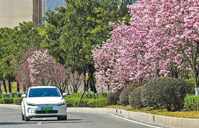 2月25日,两江新区龙盛新城福生大道,玉兰花在绿化带迎风盛放。春风吹拂下,玉兰花、美人梅、红叶李等次第吐艳,繁花满城,春意扑面。市民在街头巷尾便可邂逅浪漫春光,感受重庆蓬勃的春日气息。