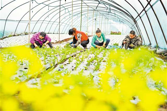 2月26日,北碚区柳荫镇麻柳河村一处蔬菜种植基地,村民在忙着栽种空心菜苗。