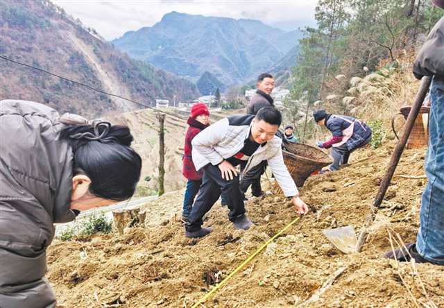 2月24日清晨,城口县周溪乡双龙村的田里还飘着一层薄雾。乡产业发展中心技术员吴成太蹲在地埂上,从帆布包里掏出卷尺。地那头,农户李昌福正弯腰往土里埋豆苗。吴成太走过去,把卷尺往两道犁沟之间一拉,看了眼距离,他站起身喊了一声:“老李,你过来看看。”