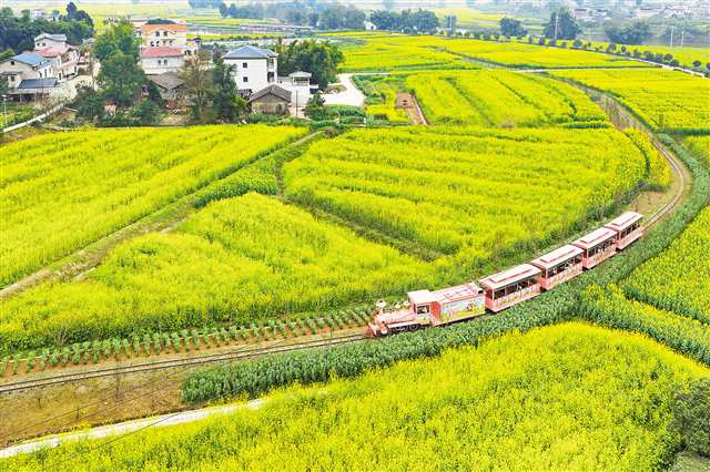 2月27日,潼南区崇龛镇陈抟故里景区,游客们乘坐观光小火车穿行在万亩油菜花海间(无人机照片)。