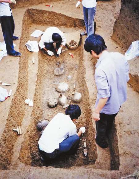 2002年,国家文物局专家查看涪陵小田溪遗址出土文物。(资料图片) |