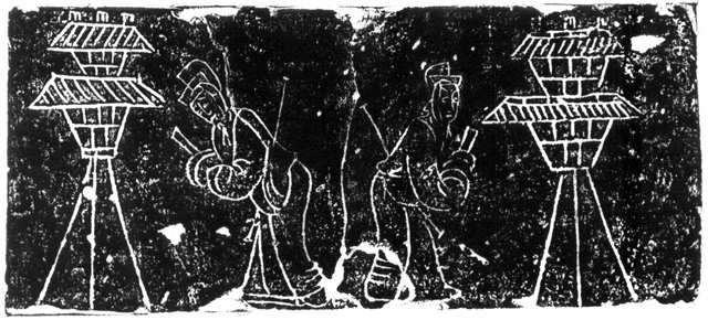 四方二骑吏画像砖上,两匹快马飞奔于道,马上的吏人短衣束带,腰系箭箙,举着幢饰,持着棨戟,驱马急行。“这正是汉代官吏出行的前导仪仗。据《后汉书》记载,三百石官吏出行才有这样的规格。”林必忠说。