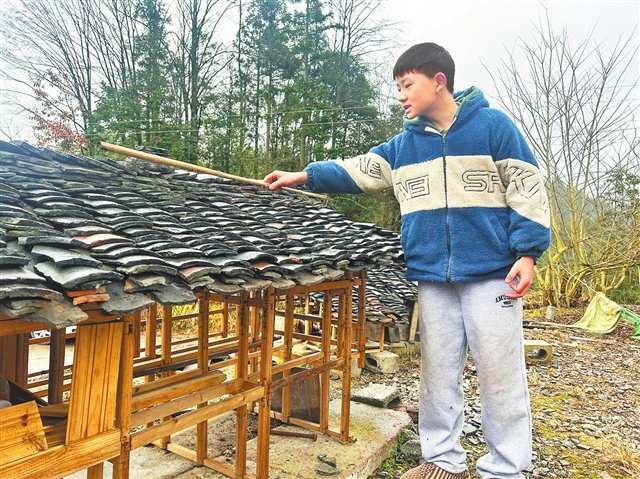 “嚓嚓嚓……”2月26日,酉阳土家族苗族自治县毛坝乡新建村,一座低矮的木房子里不时传出有节奏的刨木声。13岁的邹君杰正躬着腰,在一块木料板上反复刨削,将木板打磨平整。