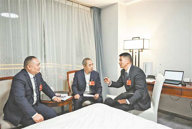3月3日晚上,重庆代表团住地,全国人大代表殷其龙、刘平、黄大勇(从右至左)围绕出租车行业现状与民众诉求,讨论如何推动出租车和网约车行业健康发展。记者 苏思 龙帆 摄/视觉重庆