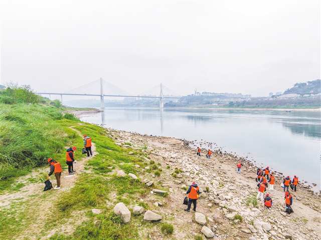3月2日,巴南区,志愿者在长江沿岸捡拾垃圾(无人机照片)。特约摄影 李攀 通讯员 郭进 摄/视觉重庆 |