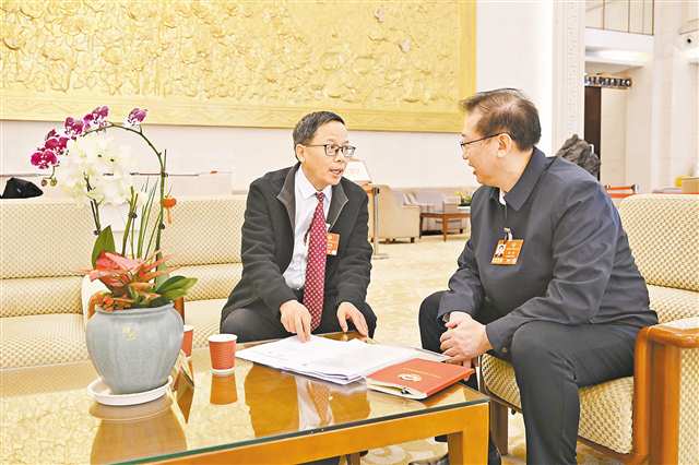 3月5日,住渝全国政协委员明炬(右)和杨新民(左)交流履职经验。通讯员 秦杰 摄/视觉重庆