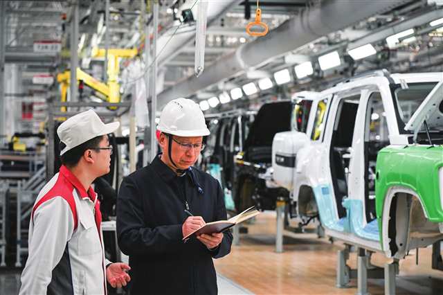 全国人大代表、中国船舶集团首席技师傅国涛(右)在企业调研 |