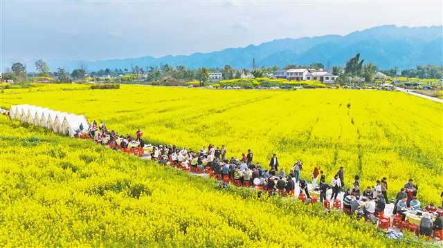 连日来,拾万镇隆平五彩田园千亩油菜花竞相绽放,每天吸引数千名游客漫步金色花海,体验花田火锅,尽享春日田园乐趣。