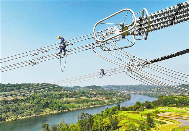 合川区沙鱼镇,哈密—重庆±800千伏特高压直流输电工程,运检员工开展走线验收。(资料图片)记者 张锦辉 摄/视觉重庆 |