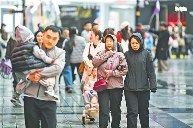 3月15日,渝中区解放碑步行街,市民穿着厚实衣物出行。受冷空气影响,重庆持续降温降雨,“倒春寒”的天气让市民纷纷换上了冬衣。