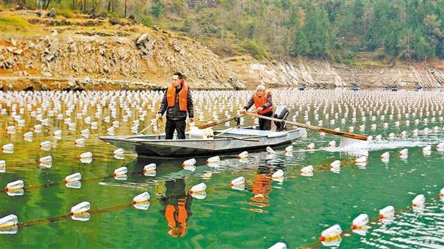 酉阳官清乡金家坝水库,工人们正在查看蚌苗生长情况。通讯员 段成军 摄\视觉重庆 |