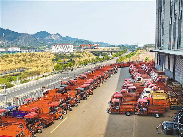 三月,重庆枢纽港产业园(江津片区)内生机盎然。在重庆尚峰科技有限公司(以下简称尚峰科技)的发运场里,13个集装箱货柜整齐列队,里面装载的不是寻常货物,而是500多台色彩明快、造型敦实的三轮摩托车。