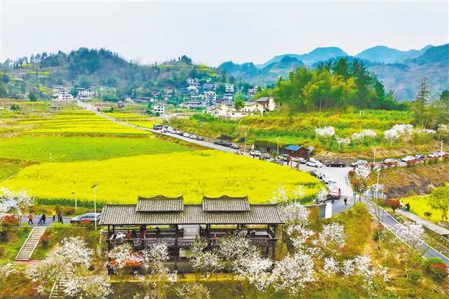 3月14日,黔江区太极镇李子村金鸡坝农业示范园区,油菜花、樱花、李花竞相绽放,吸引不少游人前来赏花游玩(无人机照片)。