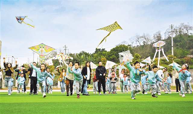 “我的风筝飞起来啦!”3月26日,大渡口区义渡小学操场上,孩子们迎着春风奔跑,一只只造型各异的风筝次第上升。