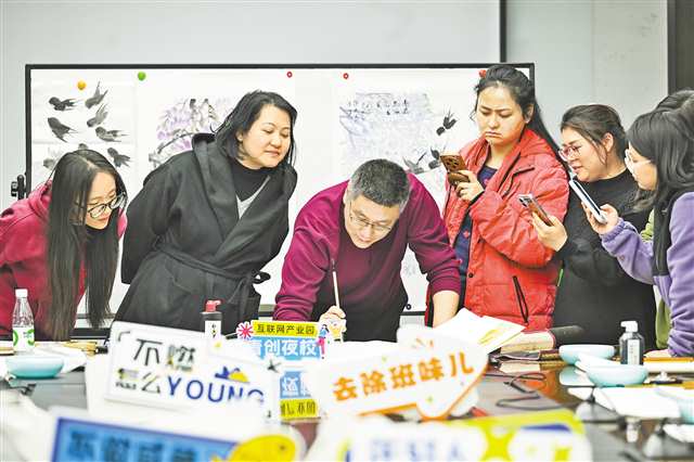 3月25日晚,两江数字经济产业园照母山核心区,“青创夜校”国画课上,学员们在认真观摩学习。