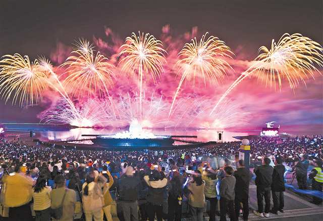 3月28日,位于长寿湖的重庆天空剧院,美丽的烟火在夜空绽放。