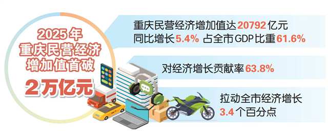 这些企业的亮眼成绩,是重庆民营经济蓬勃发展的缩影。2025年,我市民营经济实现历史性跨越,增加值首次突破2万亿元大关,达20792亿元,同比增长5.4%,占全市GDP比重61.6%,对经济增长贡献率63.8%,拉动全市经济增长3.4个百分点,成为推动重庆经济高质量发展的绝对主力军。跨过2万亿元新台阶,重庆民营经济活力迸发的秘诀,就藏在三招务实举措里。